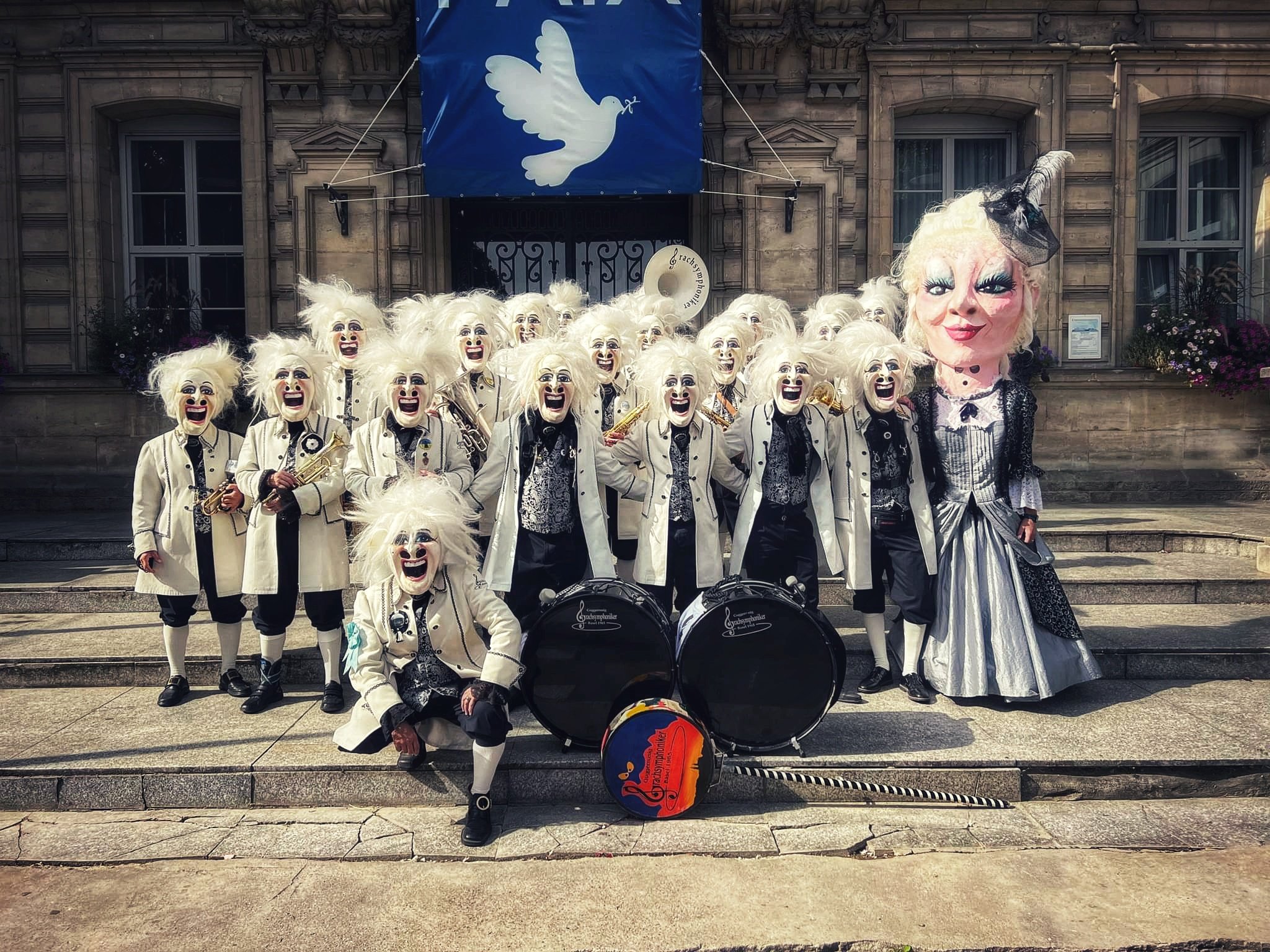 Wenn mir an dr Basler Fasnacht ufftauche, erkennsch uns sofort! Unseri uffwändigi "Wildi Mozart"-Larve mit wysse Hoor und blasser Schminki, dr eierschalefarbigi Fragg und natyrlig unseri barocki Major-Dame im feyne, silberne Glaidd, wo dr Ton aagit.